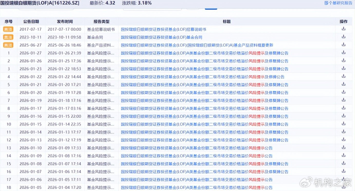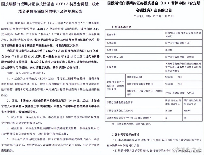 1月27日,国投瑞银基金接连发布两则公告,旗下国投瑞银白银期货证券投资基金(LOF)(以下简称“国投白银LOF”),为保护基金份额持有人利益,将于1月28日起全面暂停申购(含定期定额投资)业务,同时于1月27日开市起至10:30实施临时停牌,若二级市场交易价格溢价幅度未有效回落,将进一步警示市场风险。